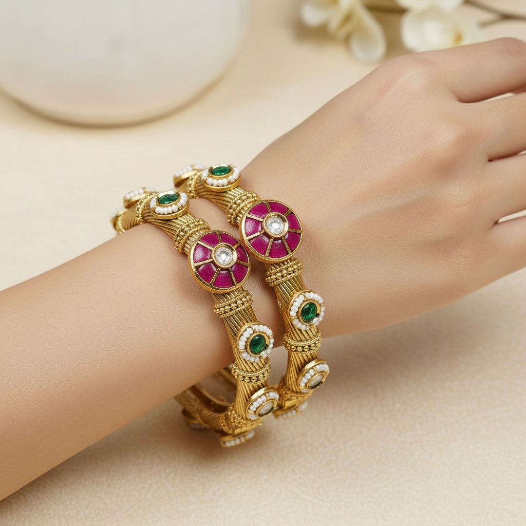 Exquisite antique bangles crafted with timeless artistry, featuring intricate stone settings that reflect royal elegance. Perfect for weddings and festive occasions, these earrings combine traditional charm with modern grace, adding a touch of luxury and sophistication to every ensemble.